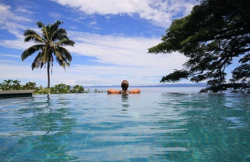 The House of Bamboo is located at the top of 100 steps allowing spectacular views of Savusavu Bay. Enjoy your very own self-catering idyll perched high above the coconut palms with amazing views of Savusavu Bay, the mountains beyond and the reef below. The entire property is exclusively yours, not shared with others, ensuring total privacy. Your own saltwater infinity pool means that you can choose between swimming in the warm tranquil waters or just hanging out on the king sized daybed, maybe even sleep out by the pool under the stars. Watch the yachts with amazing sunsets as a backdrop or enjoy a private massage in your own home. Incredible snorkeling directly out front. Unexpected luxuries like crisp Egyptian Cotton Sheets, Flat screen TV and DVD. Spacious luxury villa with 2 bedrooms, a reading room that can be converted to an extra bedroom, 2 bathrooms and conveniently located nearby Jean-Michel Cousteau Resort. Included in the tariff is a starter pack of tropical fruit, Pure Fiji products, tea, coffee and your airport pick up from Savusavu airport. Complimentary phone calls, free wifi broadband internet and laundry facilities. Complimentary kayaks, paddle boards and snorkel gear available. Daily maid service also available.