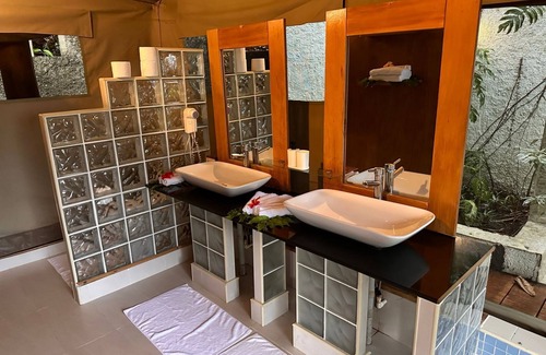 Our Luxury Tented Treehouse Bure is our most unique bure - set up in the rainforest up a series of stairs, this bure offers a beautiful bay view. This is no ordinary tent... complete with hardwood floors, soaker tub, two ceiling fans, and large outside patio, this bure gives you all the luxuries you need while giving you a true and immersive nature experience. This bure is the most secluded of our bures. It sleeps 4 with two king beds beds.